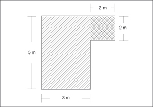 Para las habitaciones con figuras complejas se deben descomponer en áreas regulares, como cuadrados o rectángulos. Luego calcular de forma separada las áreas de dichas figuras y sumarlas. El resultado corresponderá al área total del espacio donde se pondrá el piso laminado. Este espacio está compuesto por un cuadrado y un rectángulo: