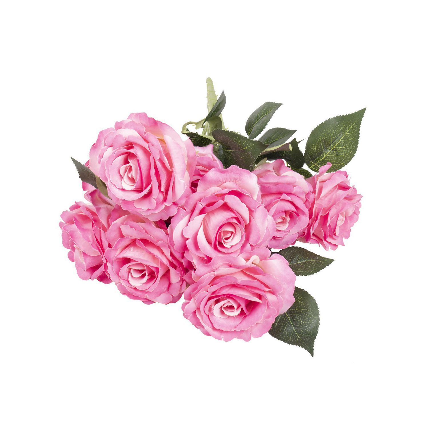 Este ramo de rosas artificiales está hecho de plástico y tiene un tamaño de 25 cm de ancho y 45 cm de alto. Su color rosa le dará un toque de alegría a cualquier ambiente. El ramo incluye 9 piezas y es ideal para decorar interiores.