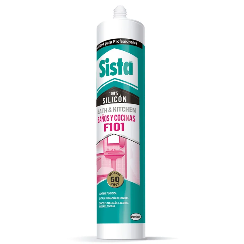 Sista F101 Baños y Cocinas es un sellador monocomponente 100% silicón de curado acético, formulado con aditivos químicos para evitar la formación de hongos en baños y cocinas. Cura rápidamente formando un hule elástico muy resistente en juntas expuestas a constante humedad. No se encoge, no se despega, no se agrieta y no se amarillea con el paso del tiempo. Proporciona un terminado blanco.