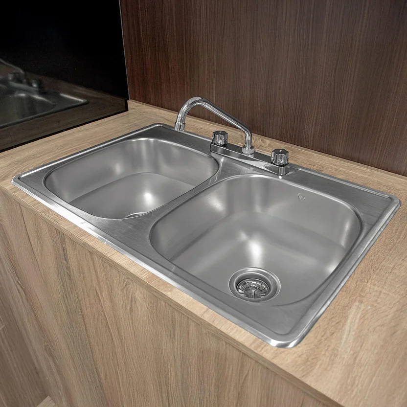 Kit Fregadero y accesorios, listo para instalar. Contiene 1 Fregadero de 2 tinas con dimensiones generales de 84 x 56 x 18 cm, calibre 22, instalación para Empotrar; acabado satinado el cual proporciona un birllo uniforme y durabilidad por muchos años. Fabricado con Acero Inoxidable proporcionando una máxima resistencia a la corrosión. Incluye llave mezcladora, céspol doble, contracanastas. ¡Todo lo que necesitas en un solo producto! Diseño y practicidad. Orgullosamente mexicanos.