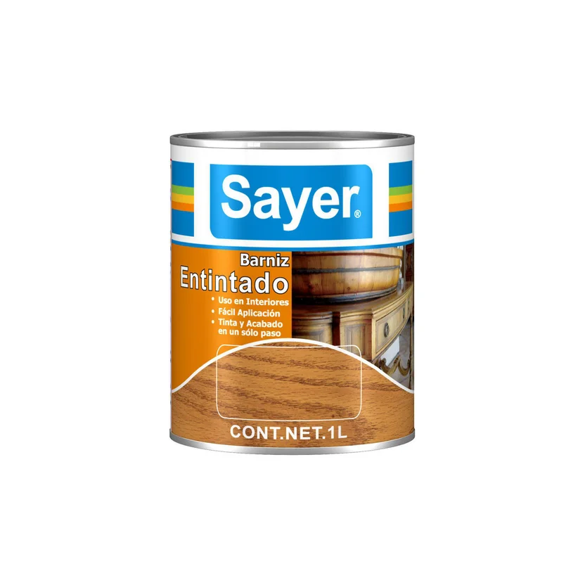 El Barniz Entintado Sayer es una línea de barnices de nitrocelulosa entintados a base de colorantes, de excelente brillo y rápido secado; permite entintar y dar acabado al mismo tiempo, dejando ver las vetas de la madera.
