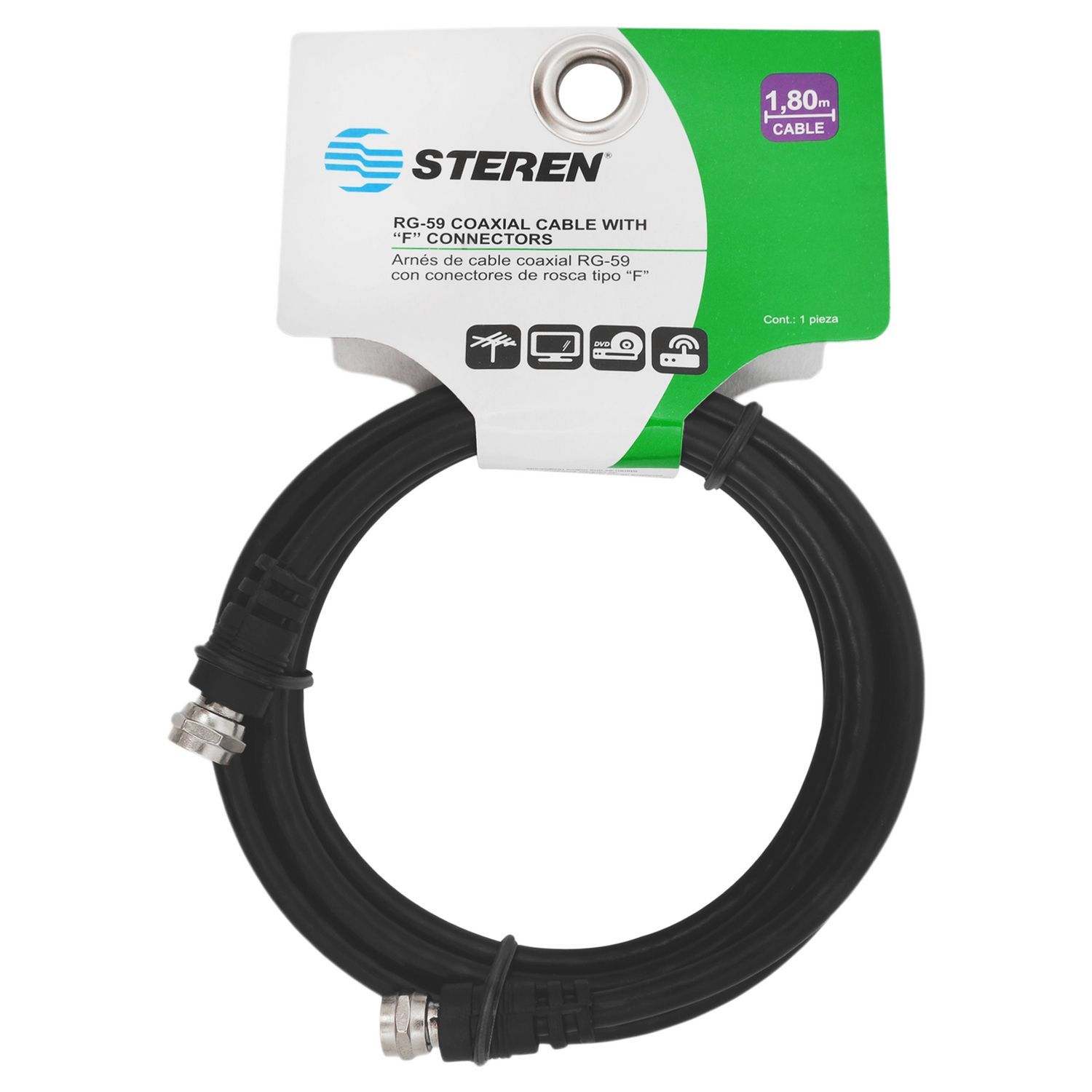 Conecta tus dispositivos de manera eficiente y segura con el Cable coaxial rosca a rosca RG59 de 1.80 m de Steren. Este cable te permitirá disfrutar de una señal de alta calidad para tu televisión, reproductor de DVD o cualquier otro dispositivo que requiera una conexión coaxial. Su diseño negro y su material de plástico lo hacen resistente y duradero, ideal para cualquier hogar.