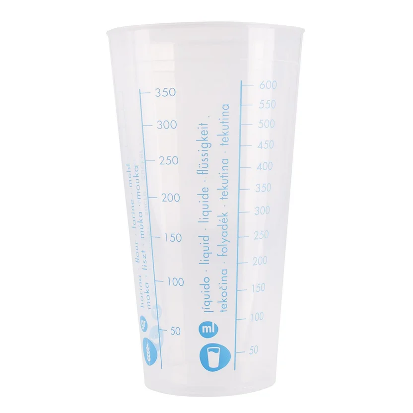 Este vaso tiene una capacidad de 600 ml y está hecho de plástico transparente. Su diseño incluye marcas de medición en mililitros y gramos, lo que te facilita la preparación de tus platillos. El vaso tiene un diámetro de 6 cm y una altura de 17 cm, lo que lo hace fácil de guardar y transportar.