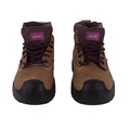 Bota de seguridad para dama con casco de poliamida. Diseño pensando en las mujeres. Uso recomendado para operadoras, almacenistas y obreras. Color Café con detalles en rosa.