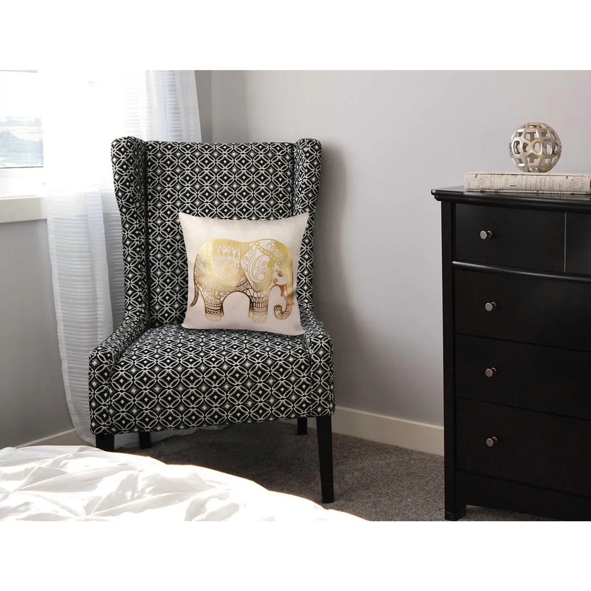 Dale un toque de estilo boho chic a tu sala con este cojín decorativo de elefante. Su diseño único con detalles en dorado le dará un toque de elegancia a tu espacio. El cojín es cuadrado y mide 43 cm de largo y 43 cm de ancho, perfecto para colocarlo en tu sofá o silla favorita.