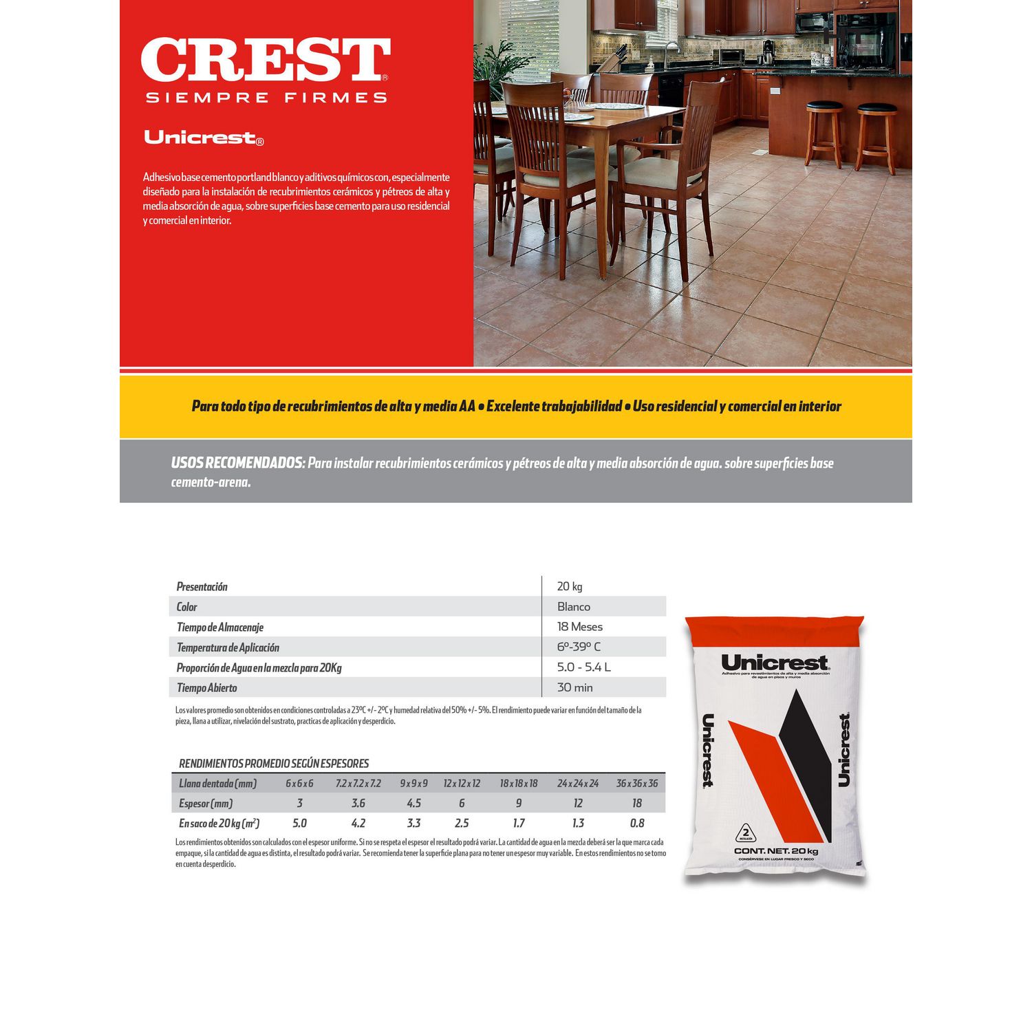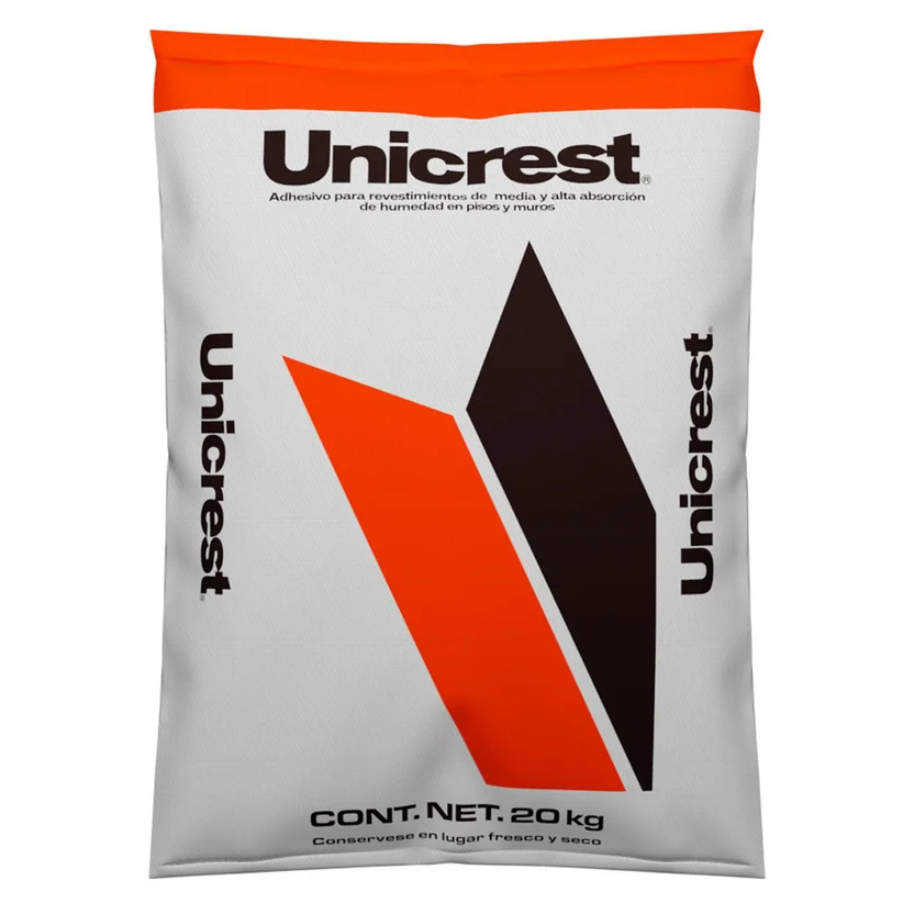 El Adhesivo UniCrest es un adhesivo tradicional de color blanco, que se presenta en un saco de 20 kg. Su secado final se completa en 24 horas, y aunque no cuenta con resistencia al agua, es ideal para ambientes protegidos del exterior. Su fórmula está especialmente diseñada para la instalación de recubrimientos cerámicos y pétreos de alta y media absorción de agua, sobre superficies base cemento para uso residencial y comercial en interior.