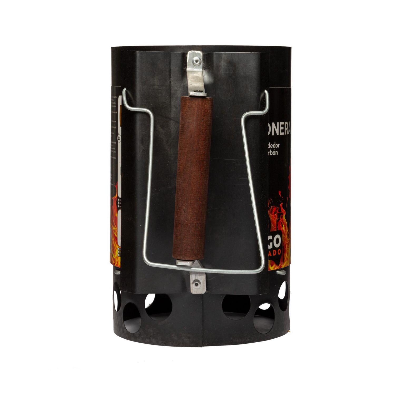 Este encendedor de carbón tiene un diseño práctico y funcional, con un tamaño de 33 cm de largo, 33 cm de ancho y 31 cm de alto. Está hecho de lámina de color negro y pesa 8.1 kg. Su diseño incluye un mango de madera para un agarre cómodo y seguro. Además, cuenta con un sistema de ventilación que permite un encendido rápido y uniforme del carbón.