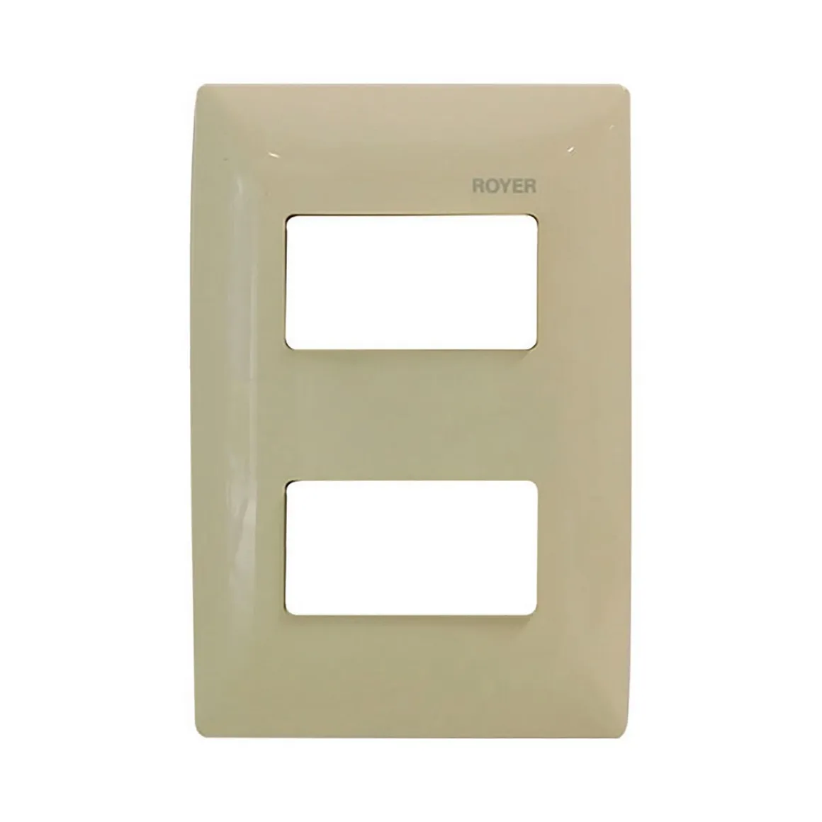 La Placa 2 Módulos Champagne de Royer cuenta con 2 agujeros para instalar interruptores o apagadores. Su diámetro de perforación es de 45 mm y su tipo de divisor es otro. La placa es de tipo embutida, lo que la hace ideal para instalar en paredes. La placa está diseñada para uso doméstico o profesional.