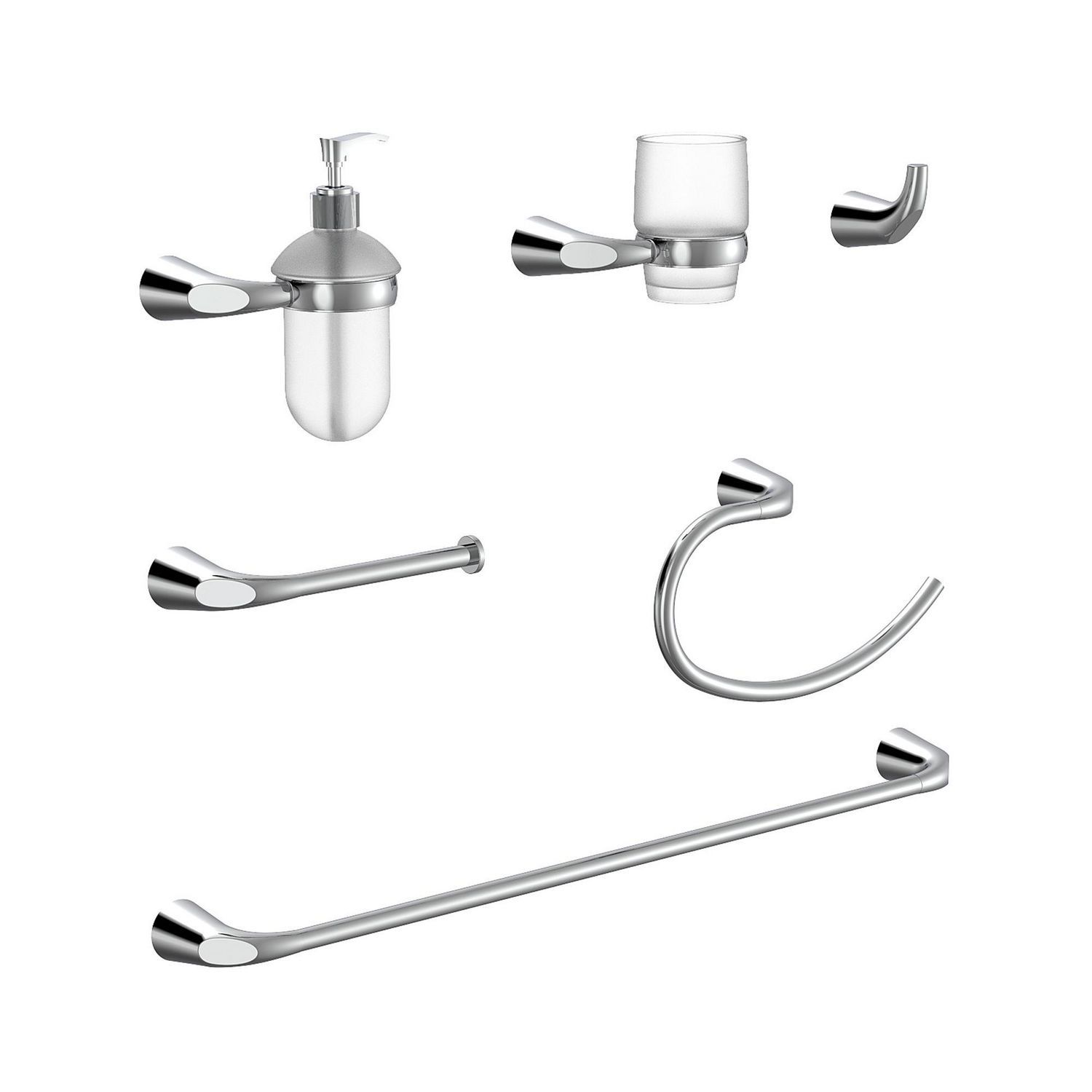 El Set de 6 Accesorios Koral está hecho de Zamak, un material resistente y duradero que soporta hasta 9 kg de peso. El toallero de barra larga soporta hasta 23 kg de peso, ideal para colgar toallas grandes. El set incluye un kit de instalación para que puedas instalarlo fácilmente en tu baño. El set es ideal para lavabos tipo vessel, de sobreponer o bowl, y permite el paso del agua hacia el lavabo para poder lavarnos las manos y cepillarnos los dientes.