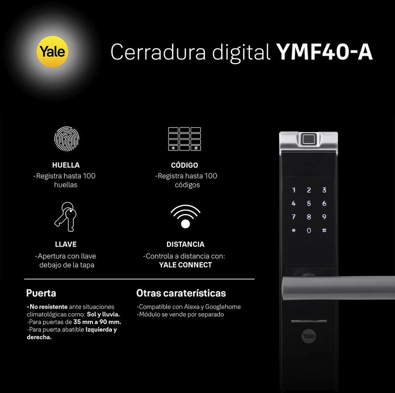 Cerradura de embutir, registra hasta 100 usuarios con huella digital, cierre automático por sensor, para puertas de 35 a 90 mm de espesor, menú asistido por voz, 2 llaves de alta seguridad., Cerradura no resistente ante situaciones climatológicas como el sol y la lluvia., Para puertas abatibles derechas e izquierdas.