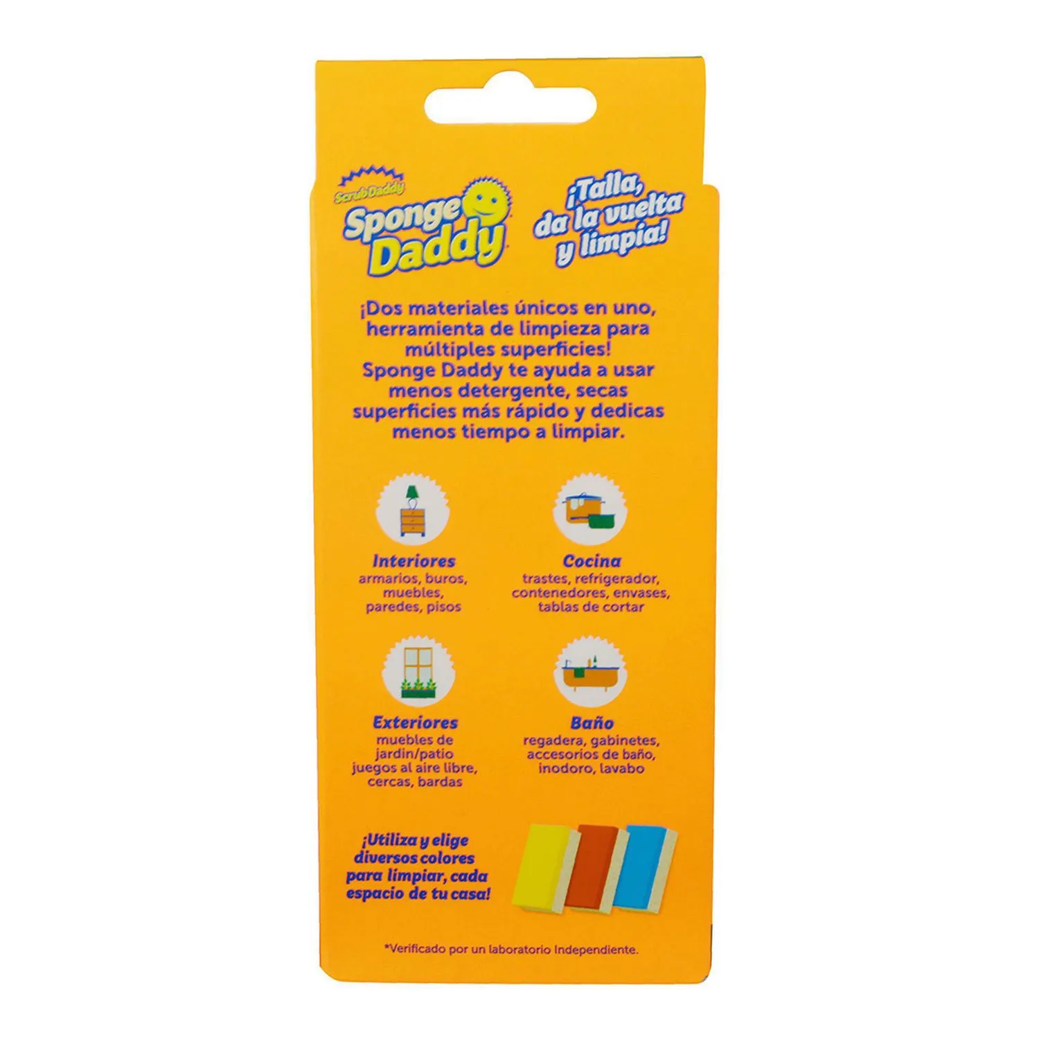 Las esponjas Sponge Daddy tienen un ancho de 16 cm, un largo de 7 cm y un alto de 6.5 cm. Son ideales para limpiar interiores, cocinas, exteriores y baños. Además, absorben más que una esponja común y generan más espuma con menos jabón. El color de la esponja cambiará con el agua, lo que te permitirá identificar cada espacio de tu hogar.