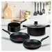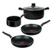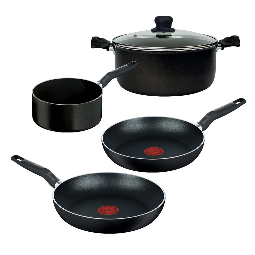 Juego T-fal de 5 piezas elaborada en aluminio, tecnología antiadherente que evita que tus alimentos se peguen y fondo durabase que permite una distribución de calor homogénea.