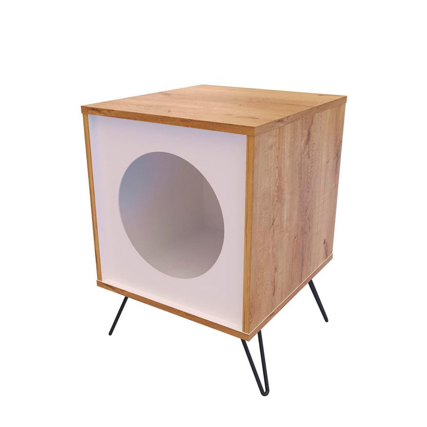 La Mesa Auxiliar Gato está hecha de tablero aglomerado y melamina, lo que la hace resistente y fácil de limpiar. Además, cuenta con patas en V metálicas que le dan un toque moderno y elegante. La mesa auxiliar requiere armado, pero es muy fácil de armar gracias a su baja dificultad. ¡No te preocupes, tu gatito podrá disfrutar de su nuevo espacio en poco tiempo!