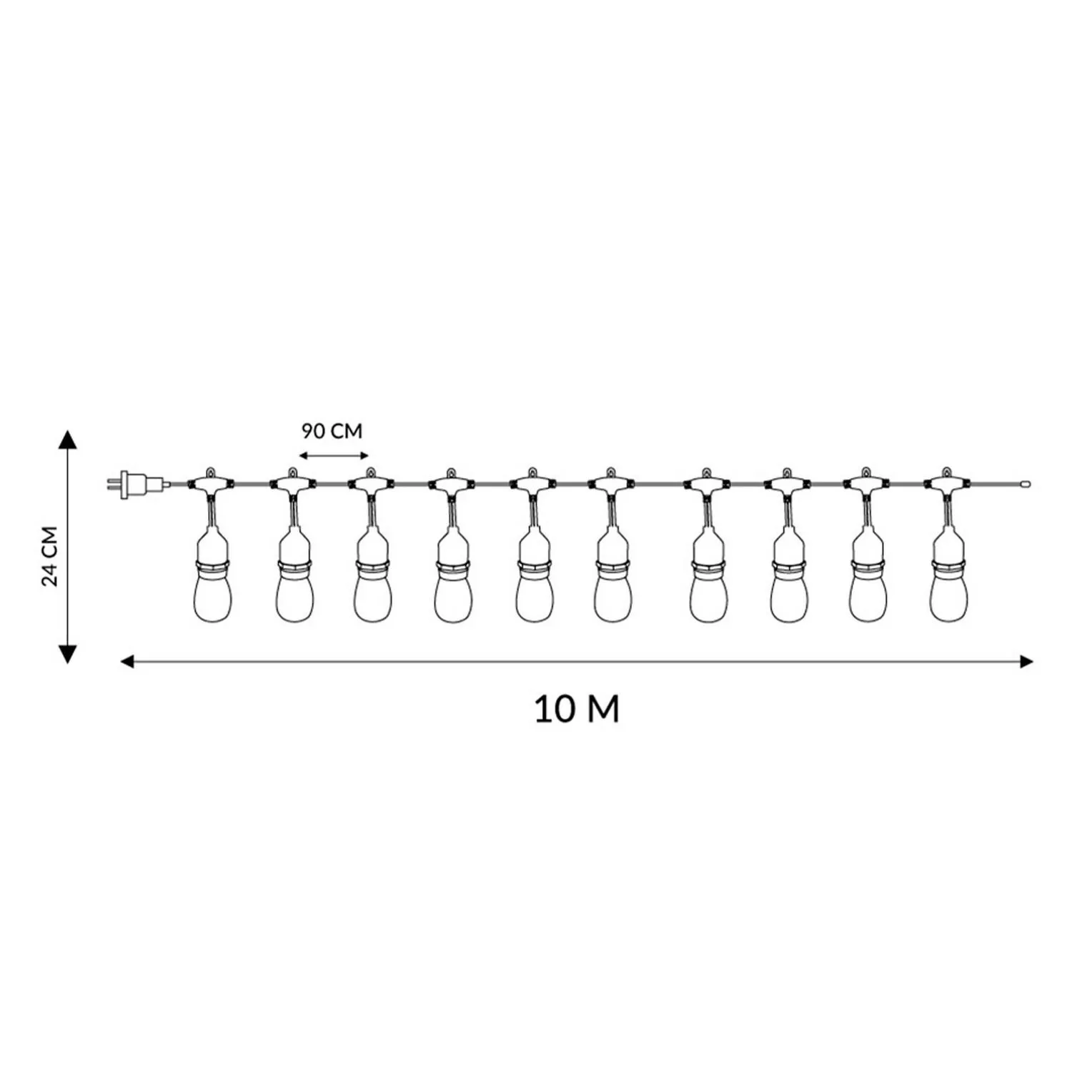 Esta guirnalda cuenta con 10 luces LED cálidas que te brindan una iluminación suave y agradable. Su largo de 10 m te permite cubrir una gran área y crear un ambiente acogedor en cualquier espacio. La distancia entre las luces es de 90 cm, lo que te permite distribuirlas de manera uniforme. Además, su nivel de protección IP65 la hace resistente al agua y al polvo, ideal para uso en exteriores. La guirnalda está fabricada con polipropileno, un material resistente y duradero que te garantiza una larga vida útil.