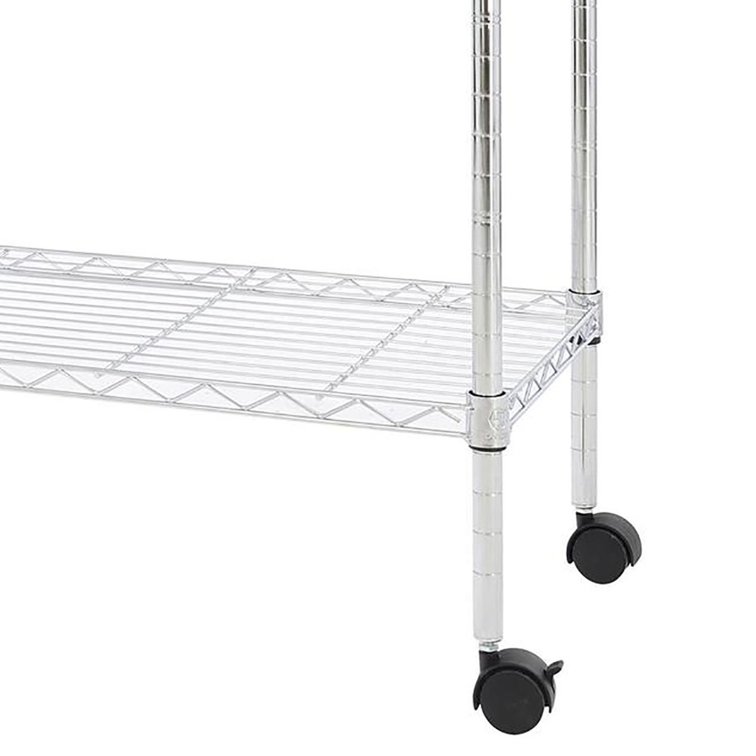 Este estante está hecho de acero cromado, lo que le da una apariencia moderna y resistente. Cuenta con 3 niveles de repisas que te permiten organizar tus objetos de forma eficiente. Además, sus ruedas te permiten moverlo fácilmente por tu espacio. El estante requiere armado, pero es muy fácil de montar gracias a su baja dificultad de armado. Su peso es de 5 kg y tiene una profundidad de 35 cm.