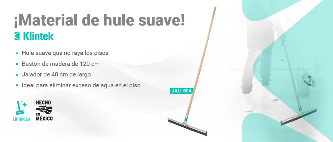 Cuerpo de lámina y hule suave que no raya los pisos, bastón de madera de 120 cm (incluído), ideal para eliminar exceso de agua en el piso, se surte en 2 piezas por separado (bastón y jalador)