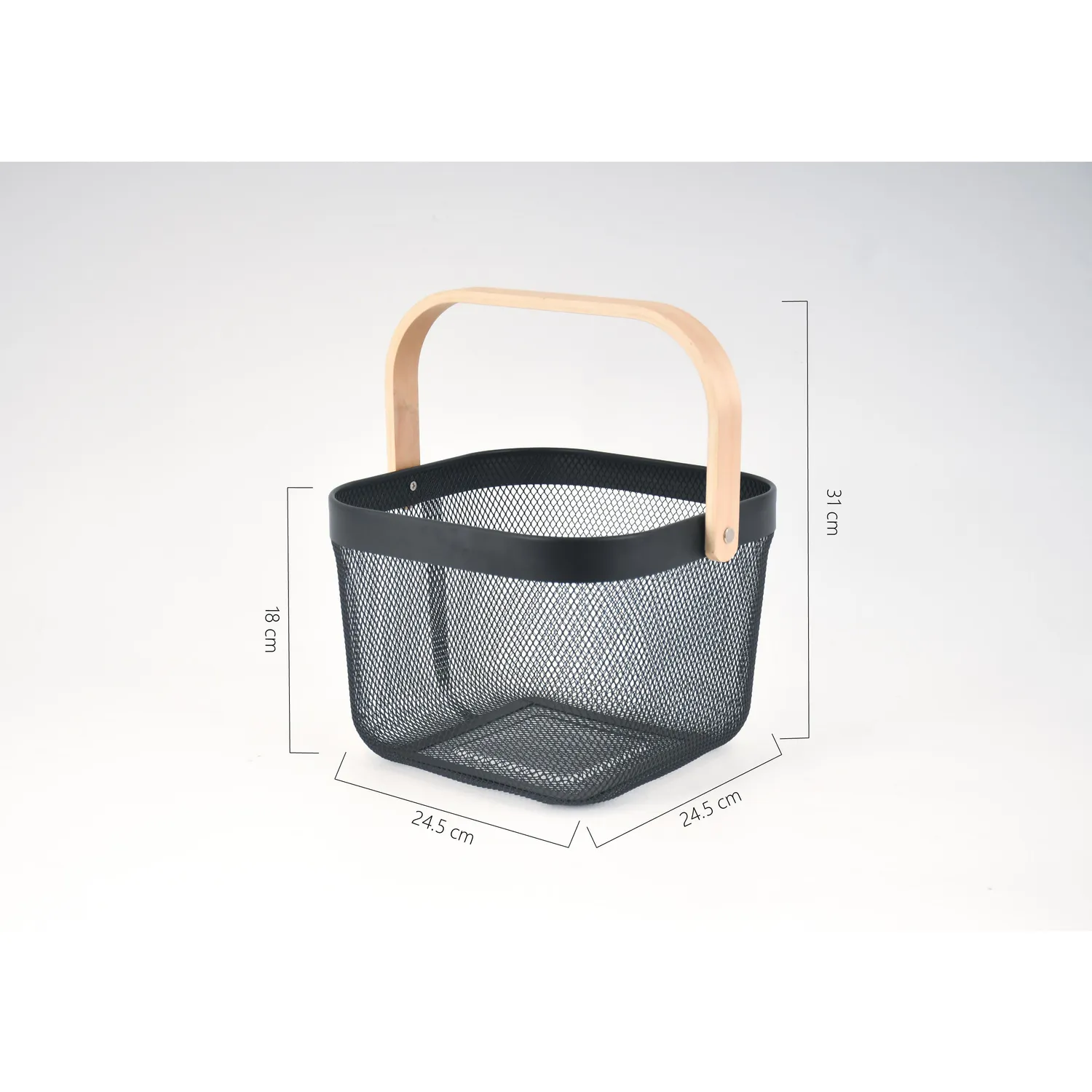 La Canasta metálica negra mango de madera tiene un ancho de 24.5 cm, un alto de 18 cm y una profundidad de 27 cm. Está fabricada con 80% metal y 20% madera, lo que la hace resistente y duradera. Su color negro le da un toque elegante y moderno. La canasta es multiusos, por lo que puedes usarla para guardar cualquier tipo de objetos. ¡Es perfecta para organizar tu hogar!