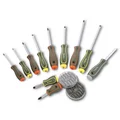 5 desarmadores de ranura, 5 desarmadores pjillips, 20 bits de 6 X 25 (L) mm en caja plástica de 2 pzas, 1 porta-bits.