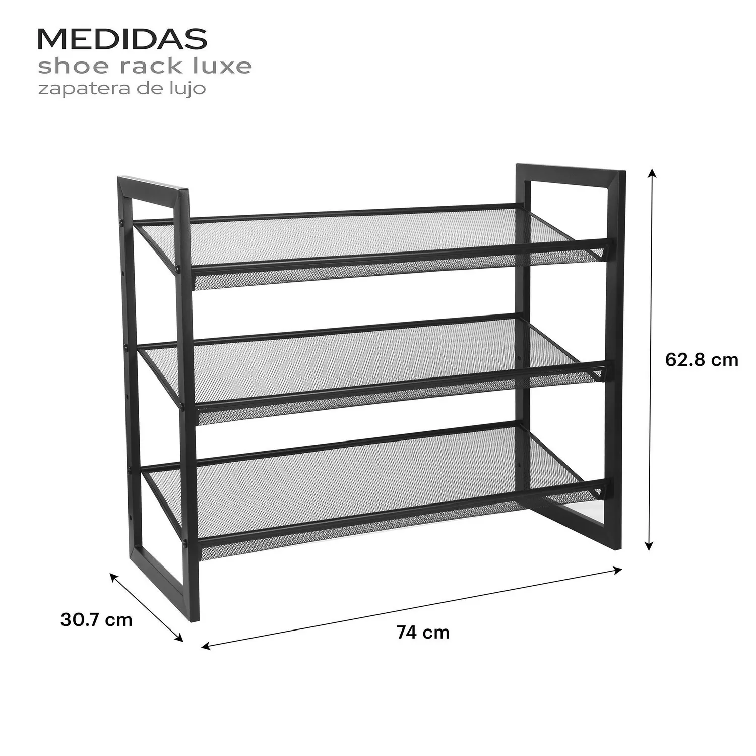 La zapatera metálica AG Box tiene un ancho de 74 cm, un alto de 62.8 cm y una profundidad de 30.7 cm, lo que la hace ideal para espacios pequeños. Su estructura de metal la hace resistente y duradera, y su color negro le da un toque elegante. Además, cuenta con tres repisas para que puedas organizar tus zapatos de forma eficiente.