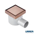 Coladera de rejilla cuadradada perimetral en acabado de rose gold. cuenta con canastilla plastica al interior que facilita el mantenimiento. bote plastico ABS que garantiza un sello Hidraulico capaz de contrarrestar evaporacion y el mal olor con desalojo de hasta 52 lpm salida Horizontal de 2"